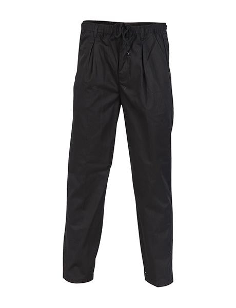 200gsm, 65% polyester, 35% cotton, wash-n-wear, elastic drawstring with belt loops and zip fly. 2 side and one back pocket